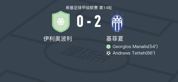 基菲夏2-0伊利奥波利,Georgios Manalis建功,Andrews Tetteh锁定胜局