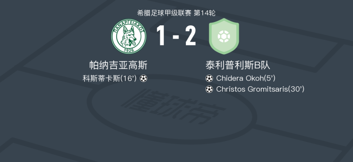 第30分钟,泰利普利斯B队球员Christos Gromitsaris打入一球。