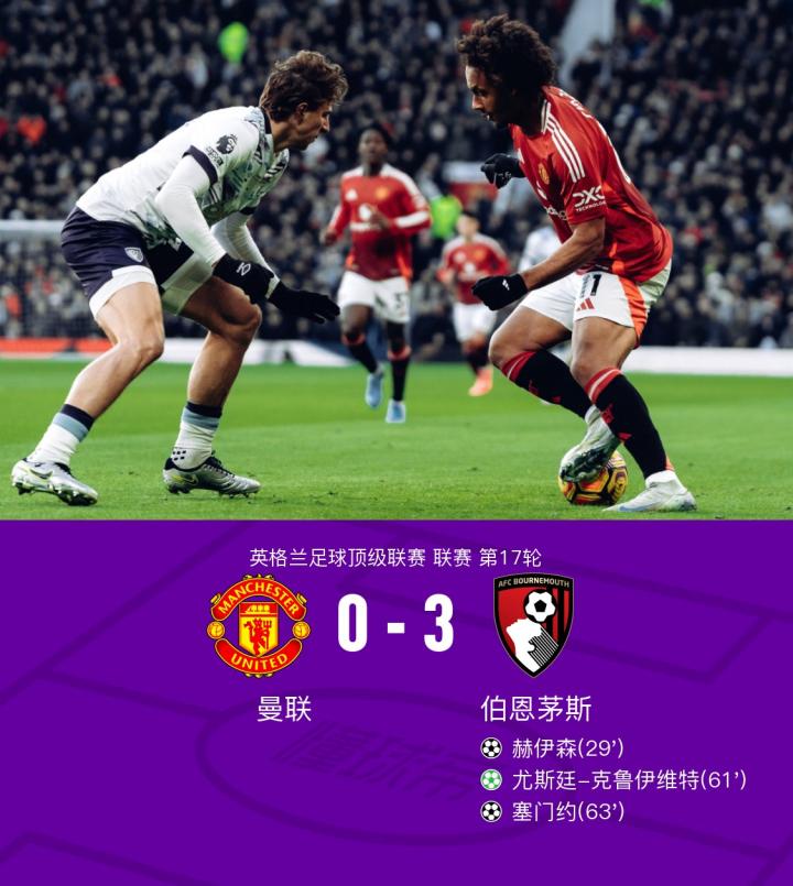 在英格兰足球顶级联赛第17轮的较量中,伯恩茅斯客场挑战曼联。上半场,克里斯蒂利用任意球机会助攻赫伊森头球破门取得领先,丢球后的曼联一度表现活跃,B费两脚远射打偏,一脚威胁射门被凯帕神勇扑出;下半场,尤斯廷-克鲁伊维特造点并亲自操刀命中,紧接着塞门约推射破门锁定胜局,伤停补时阶段,加纳乔传中,约罗推射错失良机。最终,曼联主场0-3不敌伯恩茅斯。