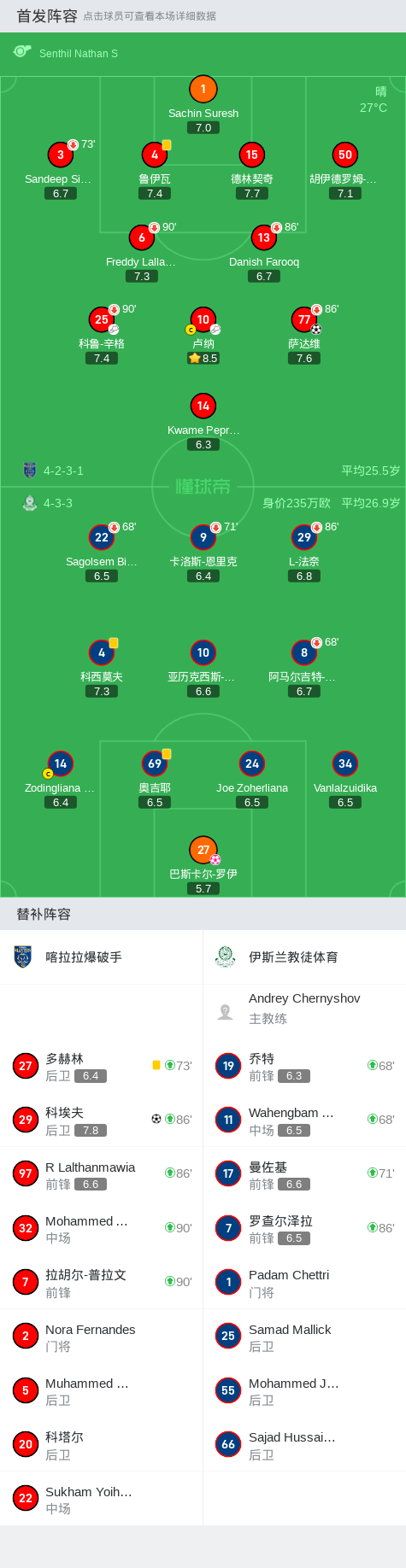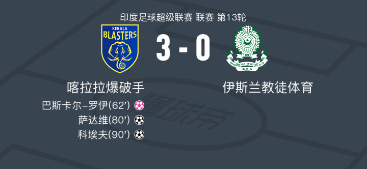 北京时间12月22日印度足球超级联赛 联赛 第13轮,喀拉拉爆破手主场对阵伊斯兰教徒体育。喀拉拉爆破手萨达维破门,科埃夫破门。伊斯兰教徒体育巴斯卡尔-罗伊自摆乌龙。最终比分喀拉拉爆破手 3-0 伊斯兰教徒体育。