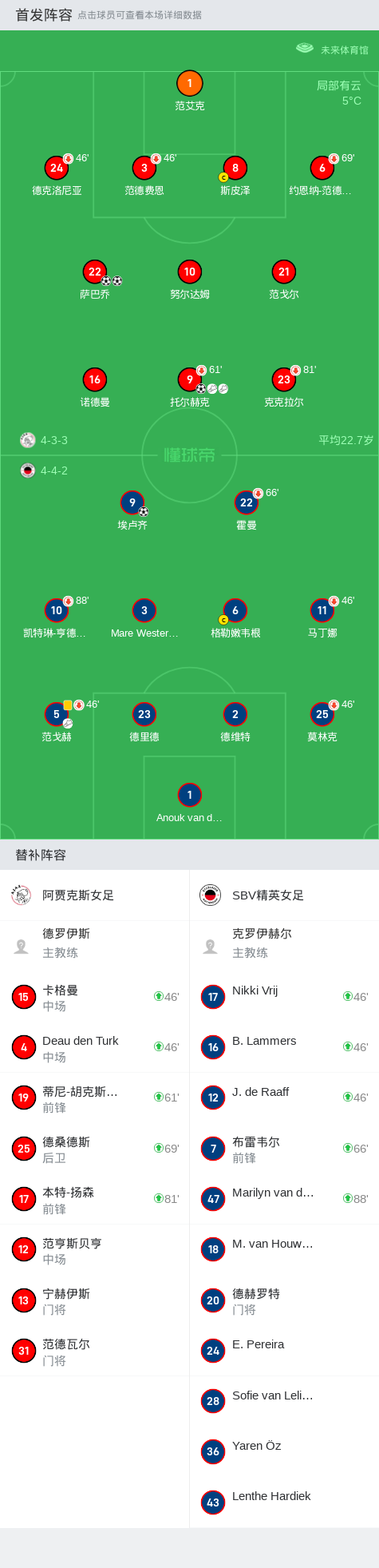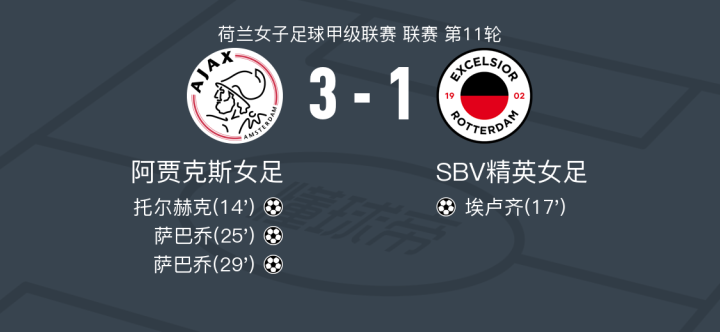 阿贾克斯女足3-1SBV精英女足,萨巴乔双响,托尔赫克1射2传