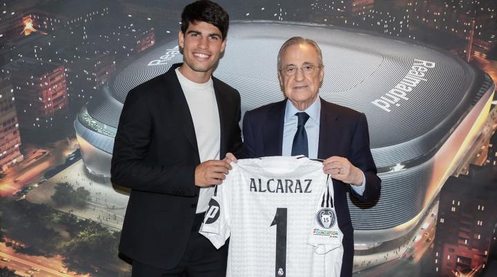 皇家马德里官方晒照,在伯纳乌球场观看皇马vs塞维利亚的西班牙网球明星阿尔卡拉斯获赠皇马1号球衣。