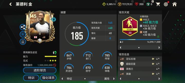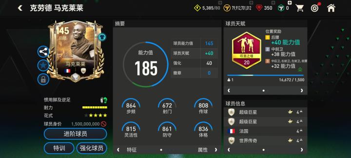 本次三国·赤壁活动推出的马克莱莱天赋配备了防守型球员常见的叹息之墙,对他的加速、人盯、铲断、拦截、侵略性五项数据都有提升。花式方面,基础花式配备马赛回旋搭配四星花式星级让马克莱莱的中场控球更为稳定。