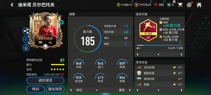贝尔巴托夫在本次三国·赤壁活动推出的球员卡天赋配备强力锋霸,对他的加速、射门、抢点、头球、力量五项数据都有提升。花式方面,基础花式配备马赛回旋的潇洒哥花式星级达到五星,前场持球进攻能力非常出色。