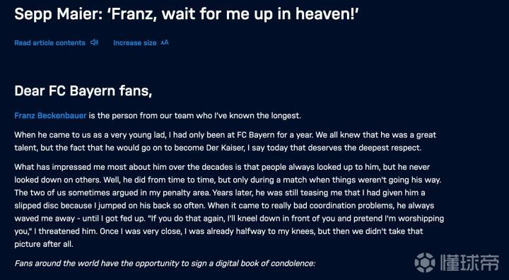最为感人的莫过于曾与贝肯鲍尔一同获得世界杯冠军的传奇门将塞普·迈尔所写的亲笔信,在信中他深情写到:“弗朗兹,在天堂等我吧,我不久后就来陪你。”