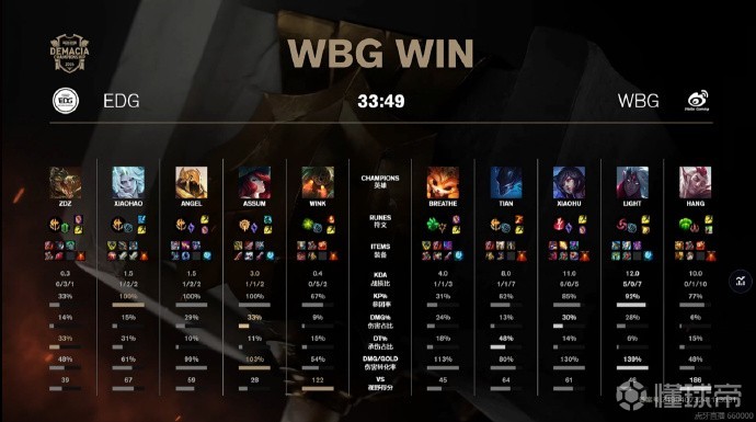 第33分钟,WBG抢下大龙打出0换5,Xiaohu拿下三杀,同时侧翼Breathe成功单带拆掉EDG基地结束比赛,3-13。