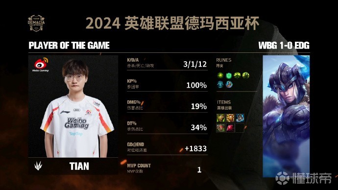 第27分钟,WBG中路推进,Light斩下三杀,WBG一波0换5团战后顺势推掉了EDG水晶拿下首局,3-15。
