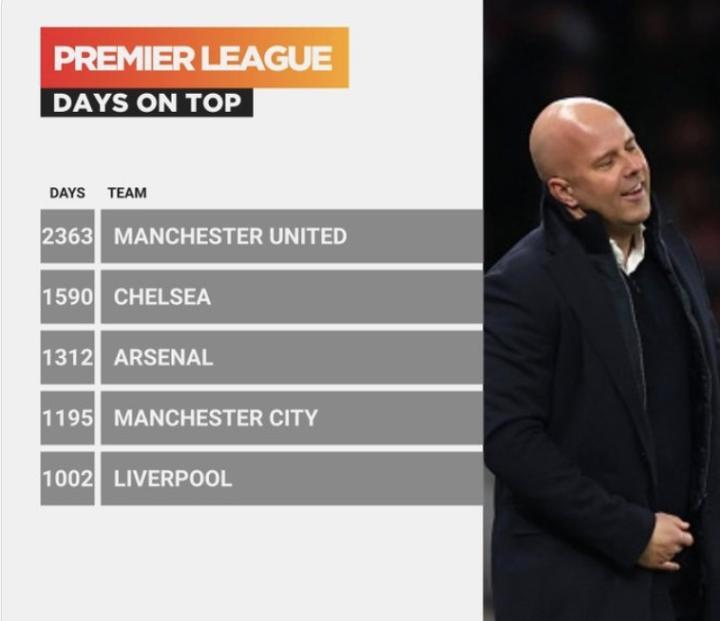 以下是英超历史上占据榜首天数最多的球队榜单: