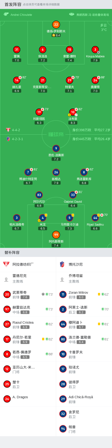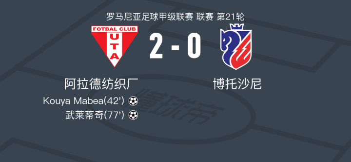 在罗马尼亚足球甲级联赛第21轮的较量中,阿拉德纺织厂坐镇主场迎战博托沙尼。比赛中,阿拉德纺织厂的Kouya Mabea率先为球队打开局面,随后,法布里送出精妙助攻,武莱蒂奇再下一城。最终,阿拉德纺织厂以2-0战胜博托沙尼,取得了本场比赛的胜利。