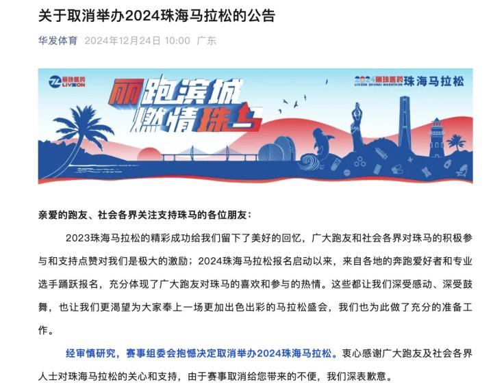 经审慎研究,赛事组委会抱憾决定取消举办2024珠海马拉松。衷心感谢广大跑友及社会各界人士对珠海马拉松的关心和支持,由于赛事取消给您带来的不便,我们深表歉意。