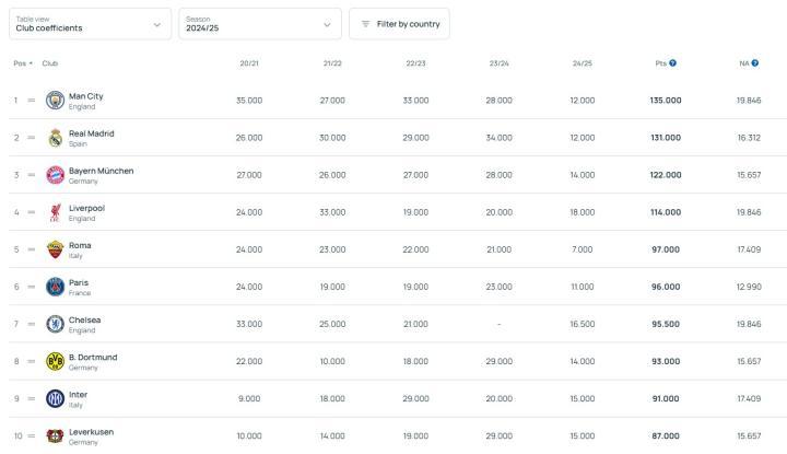 欧足联俱乐部年终系数:曼城连续三年居首,皇马第二,拜仁第三