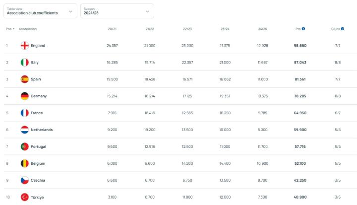 北京时间12月24日,欧足联公布了各俱乐部和协会的年终系数排名,其中,曼城连续三年位列第一,英格兰则位居协会排名第一。