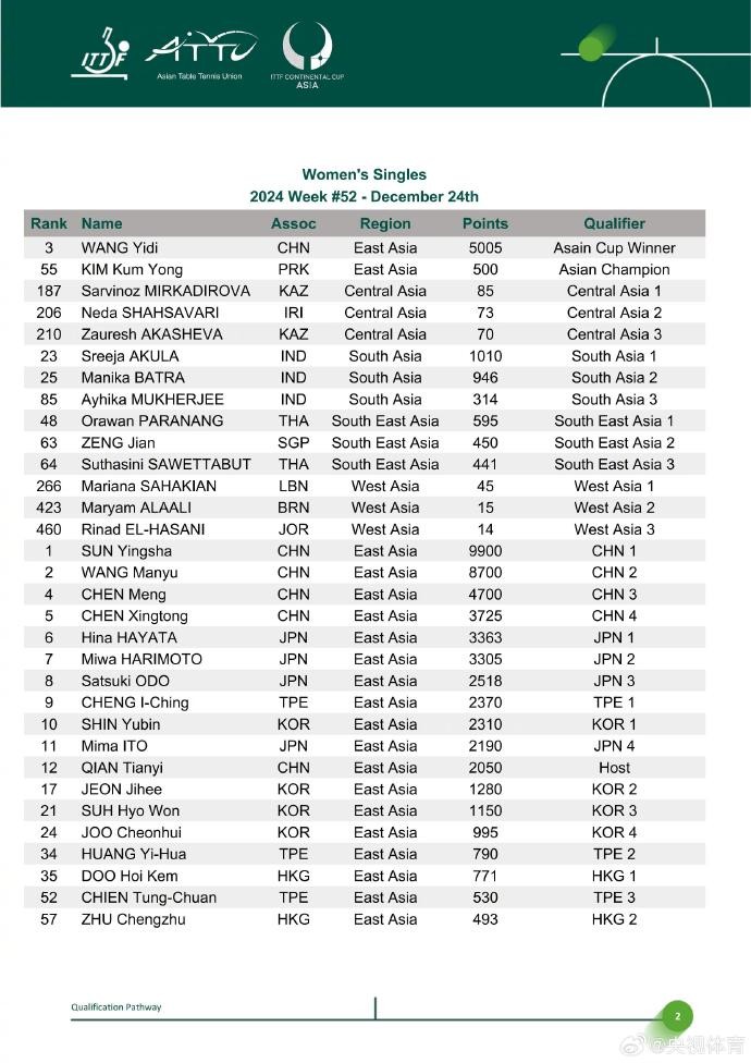 女单方面,上一届亚洲杯冠军王艺迪和上一届亚锦赛冠军金琴英自动获得参赛资格。