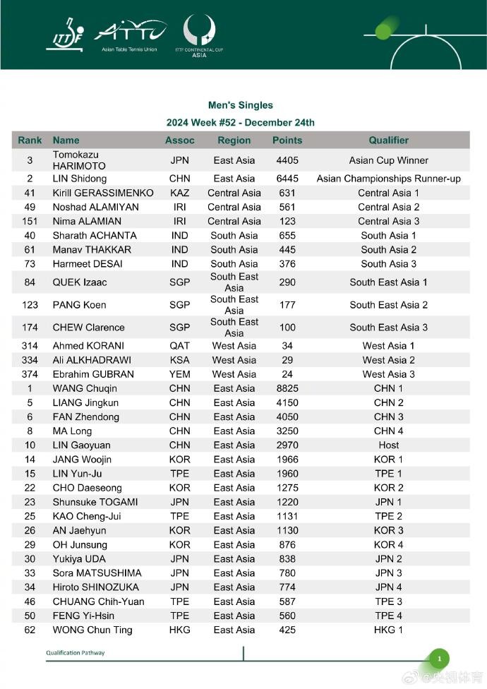 男单方面,上一届亚洲杯和亚锦赛冠军均为张本智和,亚锦赛亚军林诗栋顺延自动获得参赛资格。