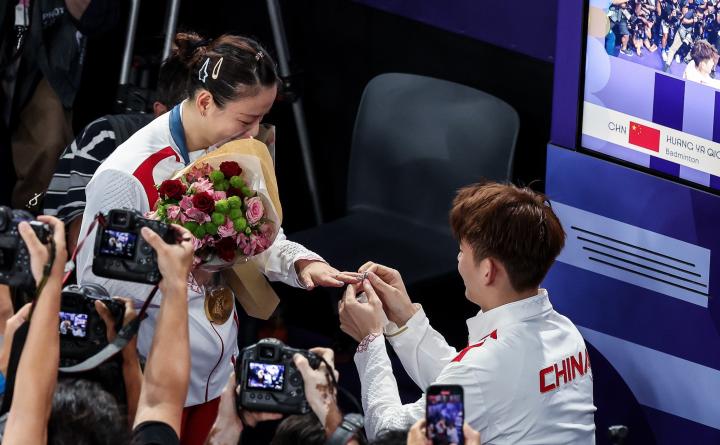 巴黎奥运会羽毛球混双决赛,黄雅琼搭档郑思维夺得冠军。在颁奖仪式合影环节结束后,羽毛球运动员刘雨辰拿出了准备已久的戒指,对黄雅琼说:“你愿意嫁给我吗!”哭得梨花带雨的黄雅琼不假思索地喊出“愿意!”这一天,黄雅琼迎来了“事业与爱情”双丰收。