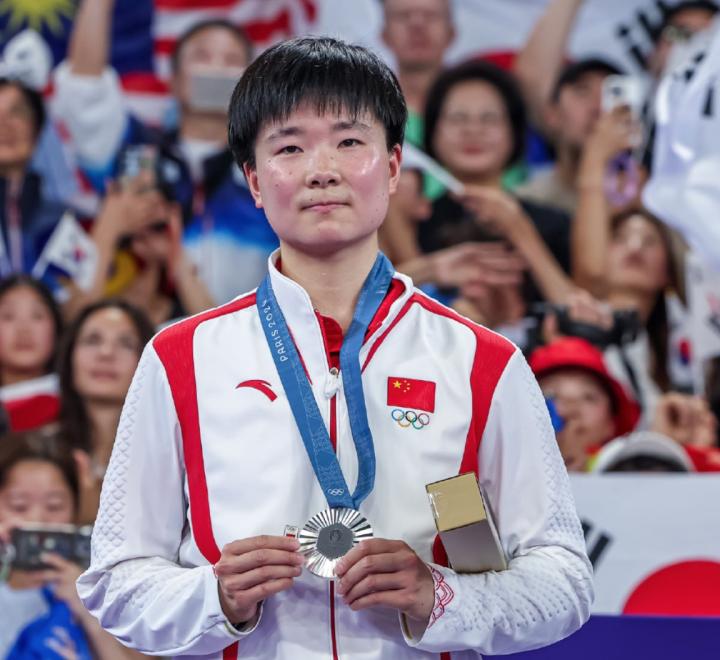 2024巴黎奥运会羽毛球女子单打决赛,中国选手何冰娇不敌安洗莹摘得银牌。颁奖仪式上,何冰娇左手展示着自己拿到的银牌,右手拿着一枚小小的西班牙徽章。