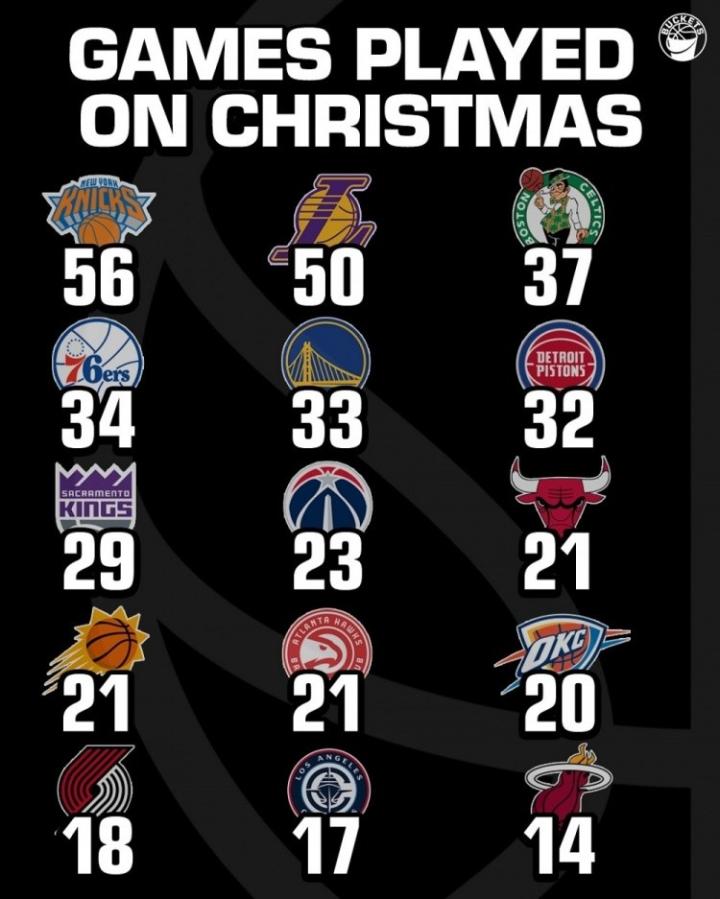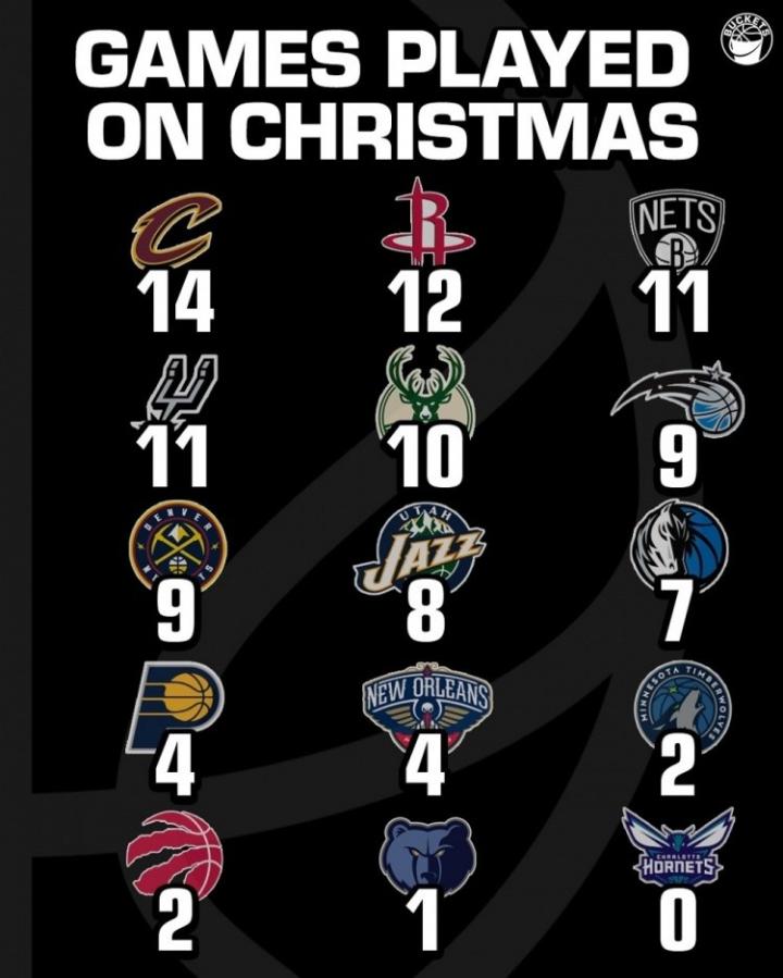NBA圣诞大战各队参赛次数:尼克斯56次居首,黄蜂0次垫底
