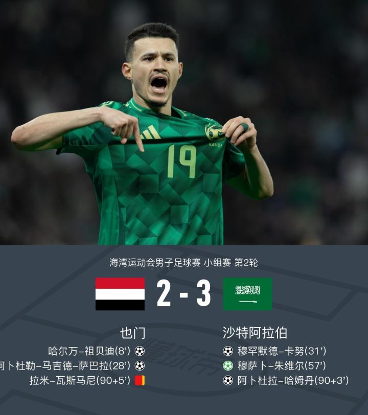 沙特阿拉伯3-2逆转也门,穆萨卜-朱维尔点射、阿卜杜拉-哈姆丹破门