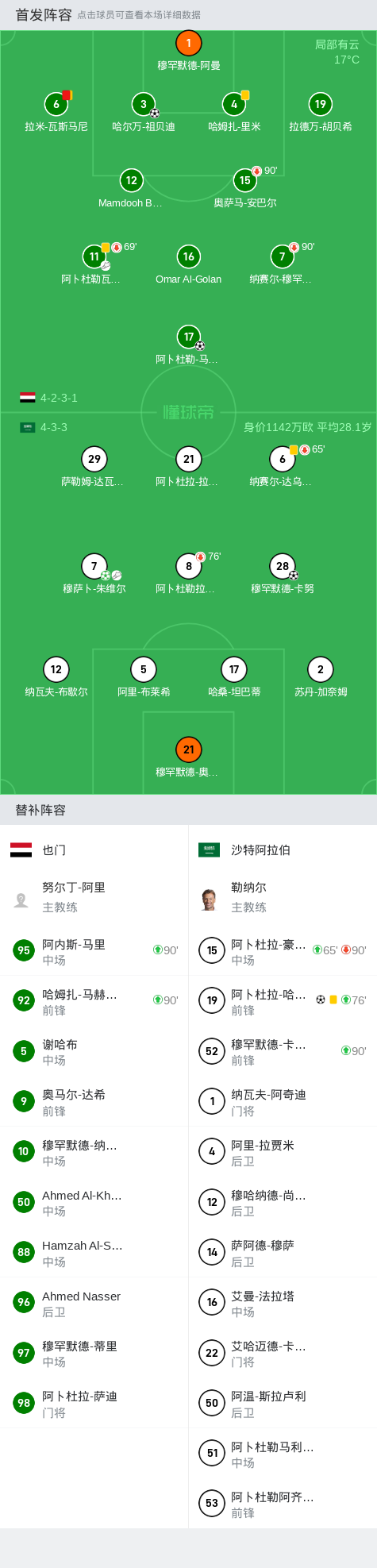 第31分钟,沙特阿拉伯球员穆萨卜-朱维尔助攻穆罕默德-卡努打入一球。