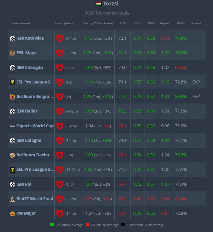 托神在2024年跟随MOUZ拿下EPL-S19赛季冠军、BB别墅杯S1赛季冠军,IEM成都和里约站亚军,以及IEM卡托、电竞世界杯、IEM科隆、BB别墅杯S2赛季、上海Major第3名,torzsi获得了其中EPL-S19和BB别墅杯S1两项赛事EVP,并无MVP称号入账。