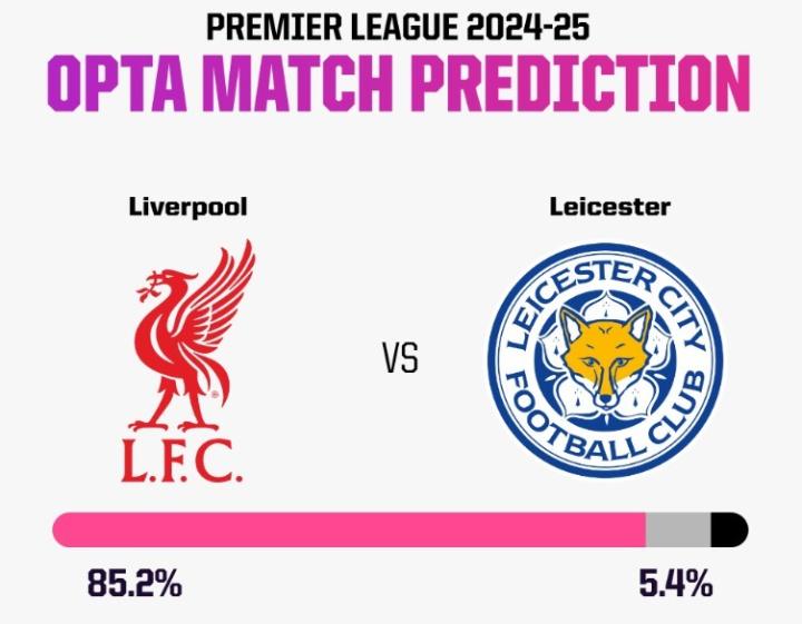 Opta的超级计算机在赛前进行10000次模拟,预测出利物浦赢球概率高达85.2%,莱斯特城取胜可能性仅有5.4%,平局的概率为9.4%。