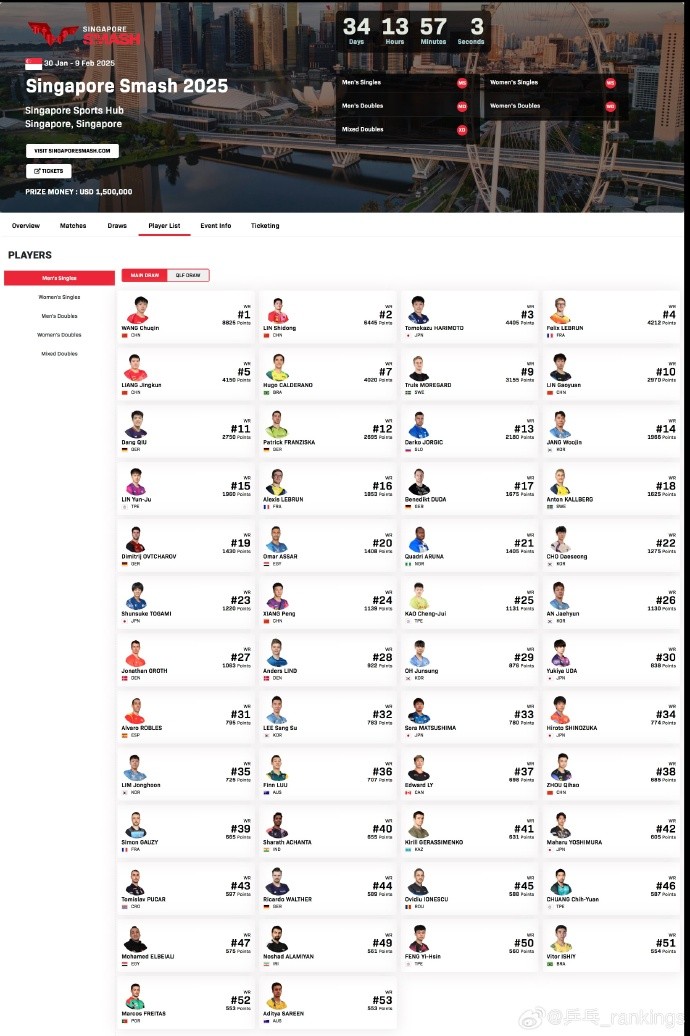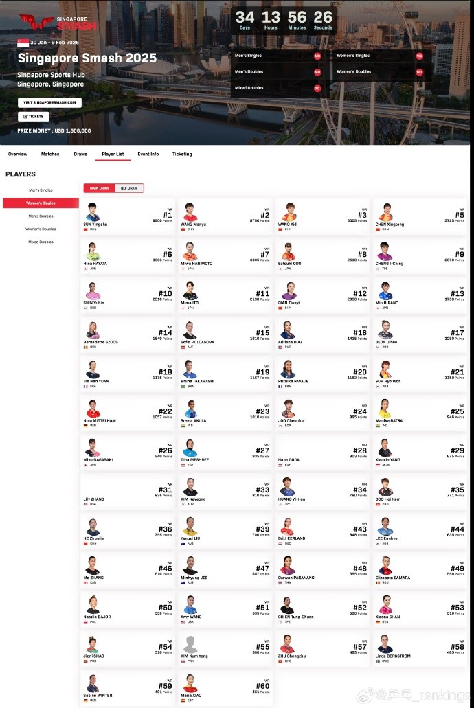 北京时间12月26日,2025WTT新加坡大满贯参赛名单公布: