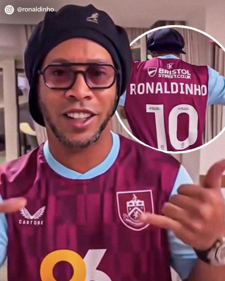 在视频中,罗纳尔迪尼奥特意展示了自己身上的伯恩利球衣,球衣上不仅印有他的名字,还带有标志性的10号号码。