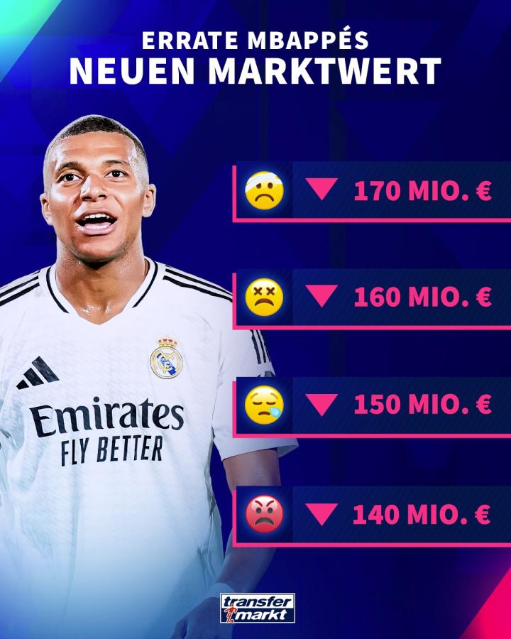 德国转会市场预热了皇家马德里前锋姆巴佩的身价更新,他的身价将下跌至少1000万欧元,最低可能跌至1.4亿欧。