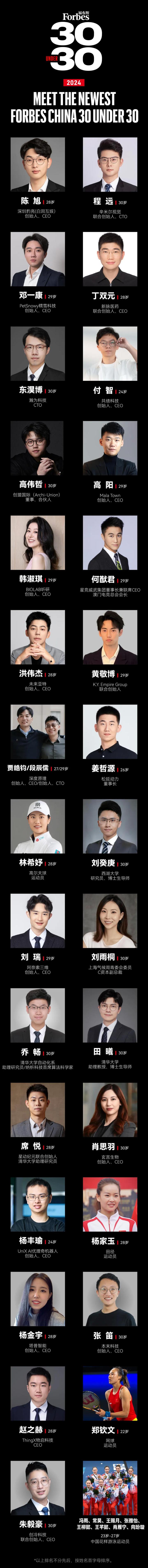 福布斯官方写道:福布斯一贯以前瞻性的目光,寻找那些30岁以下,在业内崭露头角,或者展现出成为未来行业及社会翘楚的潜在力量。他们包括创业新贵、杰出的企业经理人和演艺、体育、科研及文化界人士。
