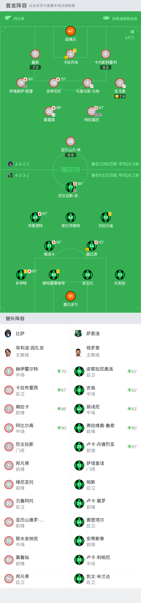 第70分钟,萨索洛球员尼古拉斯-皮耶里尼打入一球。