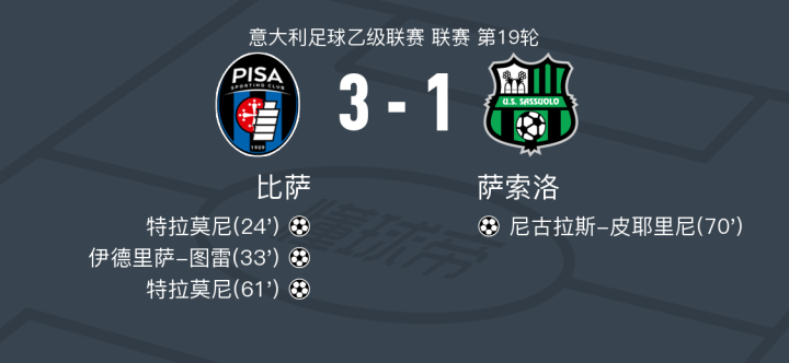 比萨3-1萨索洛,特拉莫尼双响,伊德里萨-图雷破门