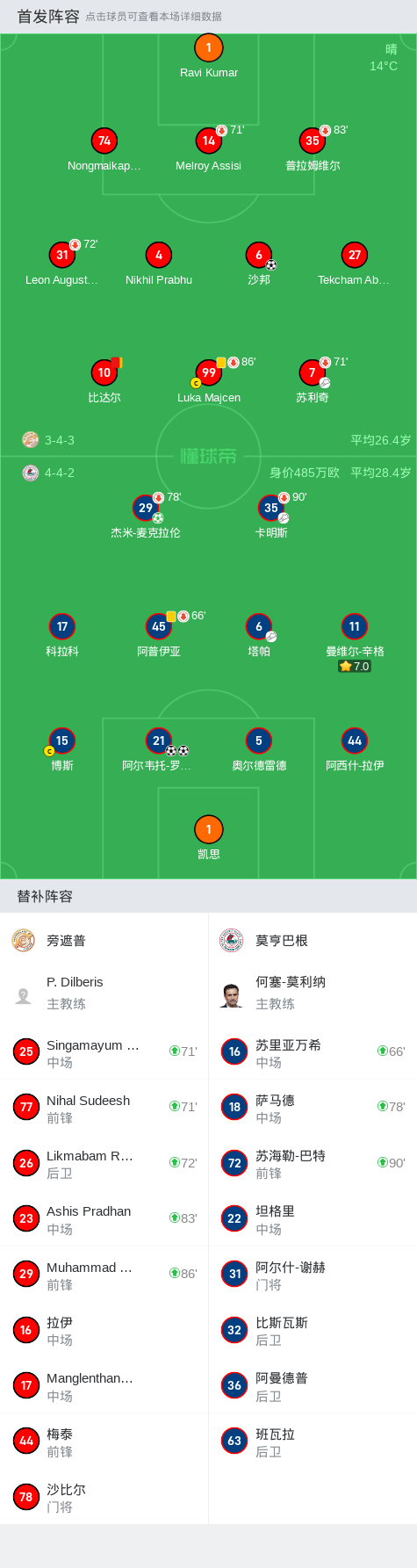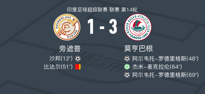 在印度足球超级联赛第14轮的较量中,旁遮普坐镇主场迎战莫亨巴根。比赛中,旁遮普的沙邦在队友苏利奇的助攻下率先破门,为主队取得领先。然而,莫亨巴根迅速调整,阿尔韦托-罗德里格斯在卡明斯的助攻下扳平比分。比赛中,旁遮普的比达尔因累计黄牌被罚下,给球队带来不小的压力。随后,莫亨巴根的杰米-麦克拉伦通过点球机会帮助球队反超比分。阿尔韦托-罗德里格斯在塔帕的助攻下再度破门,完成梅开二度,进一步扩大了领先优势。最终,莫亨巴根以3-1的比分战胜旁遮普,取得了本场比赛的胜利。