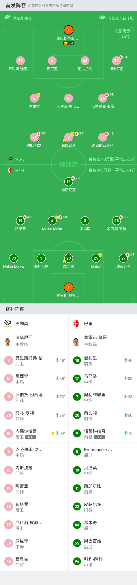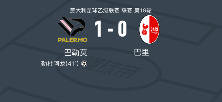 巴勒莫1-0巴里,勒杜阿龙一剑封喉战报bot @懂球帝2024-12-27 02:57在意大利足球乙级联赛第19轮的较量中,巴勒莫坐镇主场迎战巴里。比赛中,巴勒莫的勒杜阿龙表现出色,为球队打入关键一球。凭借这一进球,巴勒莫以1-0小胜巴里,成功捍卫了主场荣耀。点击查看本场比赛详细数据>>点击查看意乙完整积分榜>>精彩瞬间第41分钟,巴勒莫球员勒杜阿龙打入一球。 球队阵容 技术统计 展开更多