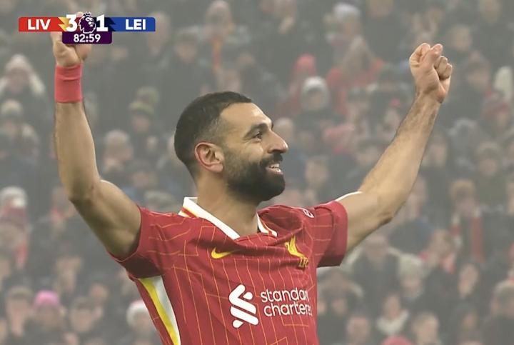 此役主场对阵莱斯特城,首发出战的萨拉赫在比赛第82分钟破门,帮助利物浦取得3-1领先。