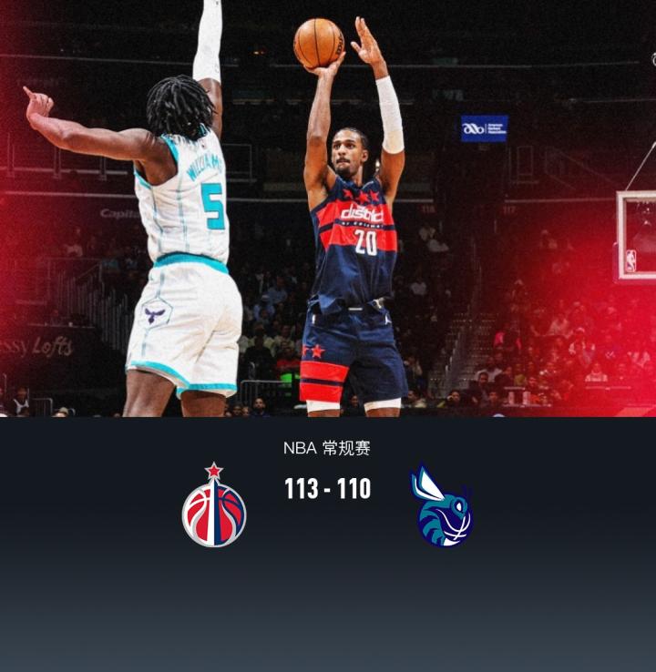 第四节奇才普尔拿下3分,黄蜂迈尔斯-布里奇斯拿下7分,最终奇才113-110战胜黄蜂