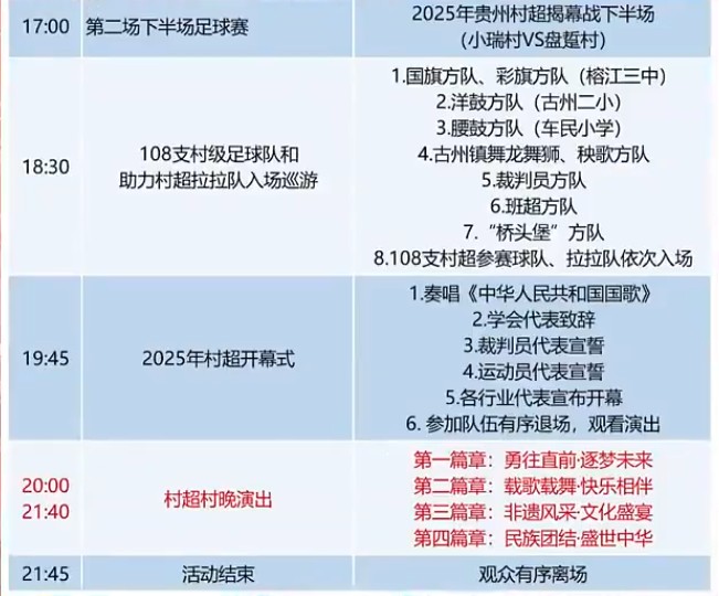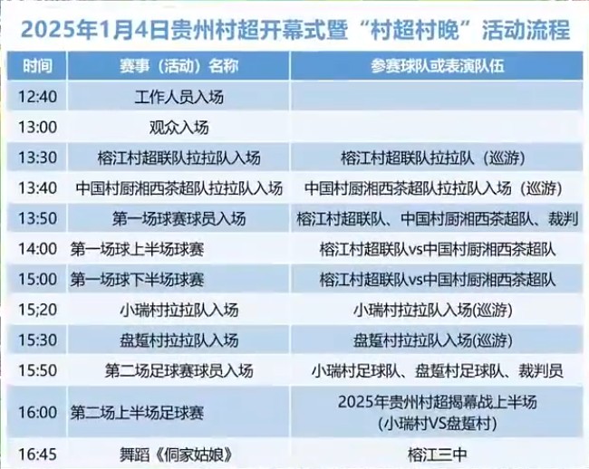 2025贵州村超开幕式将于1月4日举行,当晚还有村超村晚演出ZeroTsu_02 @懂球帝2024-12-27 11:34贵州村超联赛官方消息,2025贵州村超开幕式暨"村超村晚"活动将于2025年1月4日举行。2025贵州村超开幕式暨"村超村晚"活动流程通过官方活动流程图可以看到,比赛日当天将举办两场比赛,一场为榕江村超两队vs中国村厨湘西茶超队,另一场为2025村超联赛揭幕战小瑞村vs盘踅村。此外当晚19:45将举办2025村超联赛开幕式,108支村超队伍将出席,当晚8点,将举办村超村晚演出。展开更多