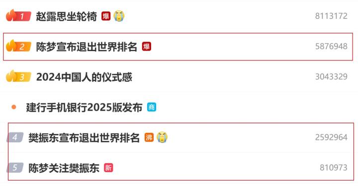 “陈梦宣布退出世界排名”登热搜第二,前五有三条与乒乓球有关这游戏太难了哈 @懂球帝2024-12-27 14:49北京时间12月27日,巴黎奥运会乒乓球单打冠军樊振东、陈梦接连发文,宣布退出世界排名。期间陈梦还关注和点赞了樊振东。这一事件也迅速引发了轩然大波,上午“樊振东宣布退出世界排名”20分钟内登上热搜第一;刚刚“陈梦宣布退出世界排名”30分钟内登上热搜第二;而目前热搜前五有三个词条跟该事件有关。相关阅读:樊振东:因WTT颁布不参赛就罚款新规,我选择退出世界排名陈梦:因最新出台WTT的退赛罚款规定,最终决定退出世界排名影响太大,“樊振东宣布退出世界排名”20分钟内登上热搜第一展开更多