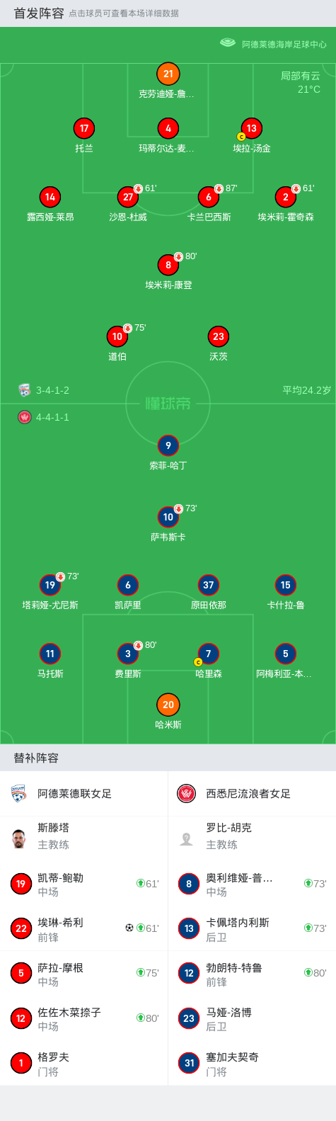 在澳大利亚女子足球W联赛第8轮的比赛中,阿德莱德联女足坐镇主场迎战西悉尼流浪者女足。比赛中,阿德莱德联的埃琳-希利成功攻入一球,为球队奠定胜局。最终,阿德莱德联女足以1-0战胜对手,取得了本场比赛的胜利。