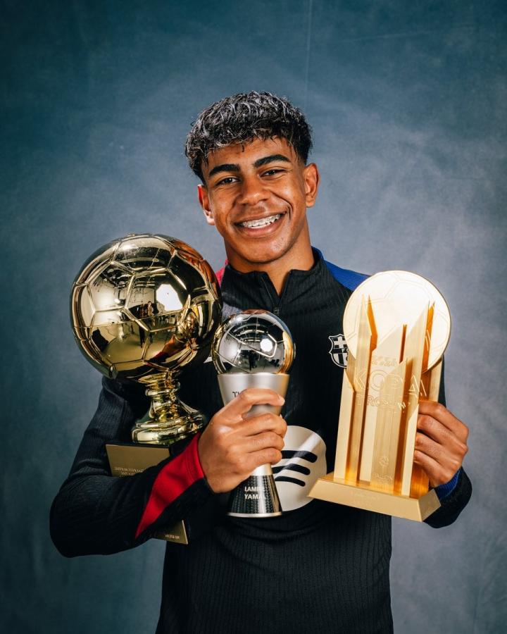 潜力无限,巴萨官方晒亚马尔手捧三座奖杯照片LaPulga @懂球帝2024-12-27 17:13巴塞罗那小将亚马尔在2024年大放异彩,巴萨官方晒出了亚马尔手捧三座奖杯的照片。凭借着过去一年在巴塞罗那和西班牙国家队的出色表现,亚马尔在今年获得了象征最佳年轻球员的科帕奖和金童奖。此外,他入选了FIFA年度最佳阵容。巴萨官方在今日晒出了亚马尔手捧这三座奖杯的照片,本赛季亚马尔代表巴塞罗那参加了21场比赛,贡献了6粒进球和11次助攻,是球队不可或缺的一员。展开更多