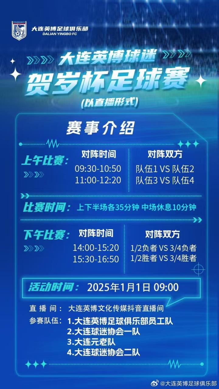 大连英博官方消息,大连英博将于1月1日举办球迷贺岁杯足球赛,并将通过网络直播。