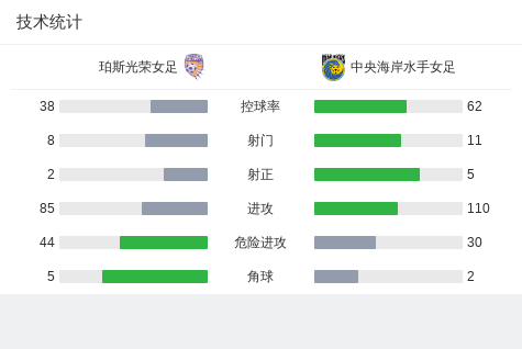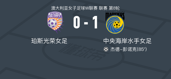 在澳大利亚女子足球W联赛第8轮的较量中,珀斯光荣女足坐镇主场迎战中央海岸水手女足。比赛中,中央海岸水手女足的杰德-彭诺克成功攻入一球,帮助球队取得领先。最终,中央海岸水手女足以1比0战胜珀斯光荣女足,取得了本场比赛的胜利。