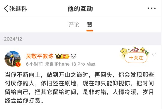 对此,曾经带过樊振东的教练吴敬平也发文回应了对他的支持。(樊振东退出世界排名,吴敬平教练:是非对错,人情冷暖,岁月终会给你打赏)随后,奥运冠军张继科也点赞了该条微博。