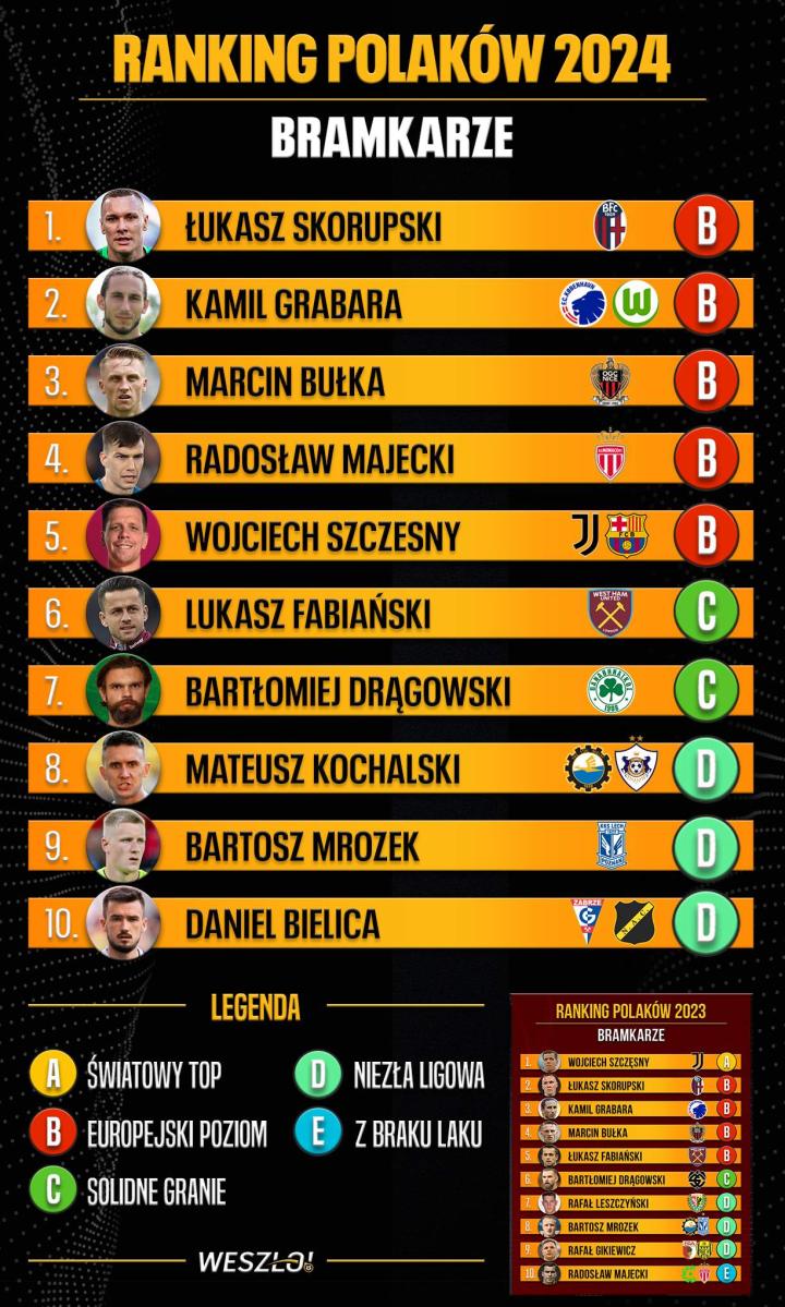 波兰球迷俱乐部波兰媒体Weszło发布了2024年的波兰球员年终排名,第一份榜单对所有波兰门将进行了点评。斯科鲁普斯基今年升入第一名,格拉巴拉、布乌卡、马耶茨基紧随其后,什琴斯尼进入前五名。