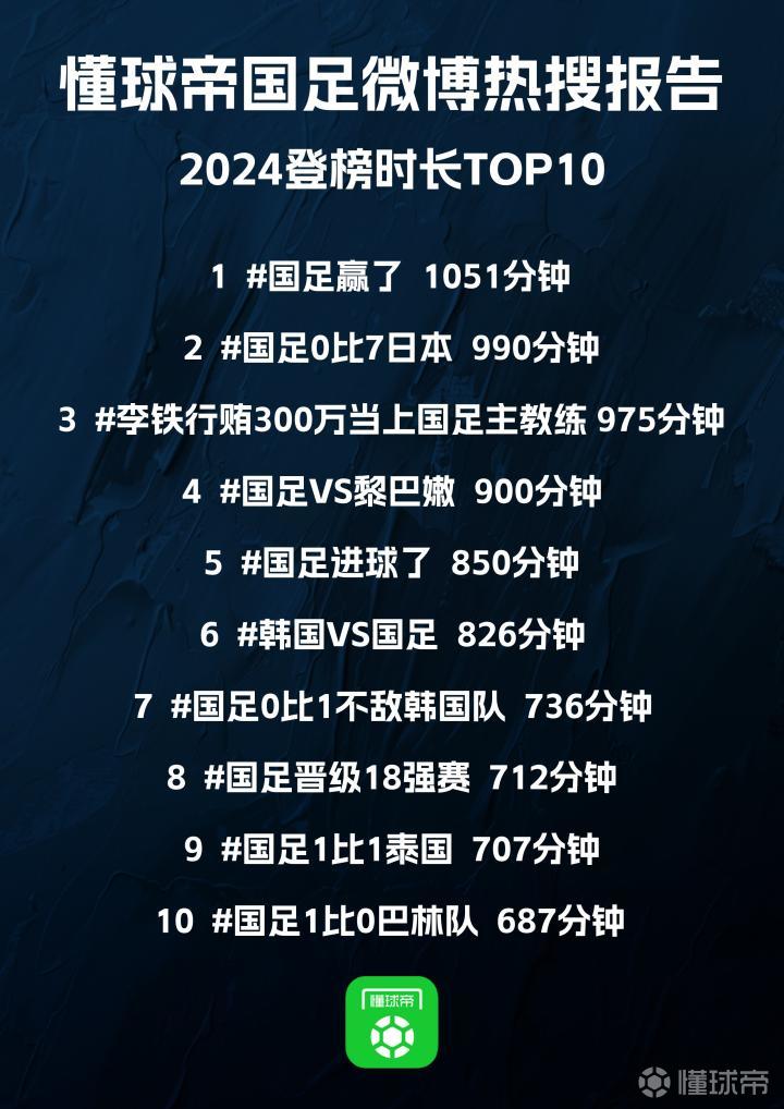 2024年,国足霸榜时间最长的热搜依次是:#国足赢了,累计在榜1051分钟;#国足0比7日本,累计在榜990分钟;#李铁行贿300万当上国足主教练,累计在榜975分钟;#国足vs黎巴嫩,900分钟;#国足进球了,850分钟;#韩国vs国足,826分钟;#国足0比1不敌韩国队,736分钟;#国足晋级18强赛,712分钟;#国足1比1泰国,707分钟;#国足1比0巴林队,687分钟