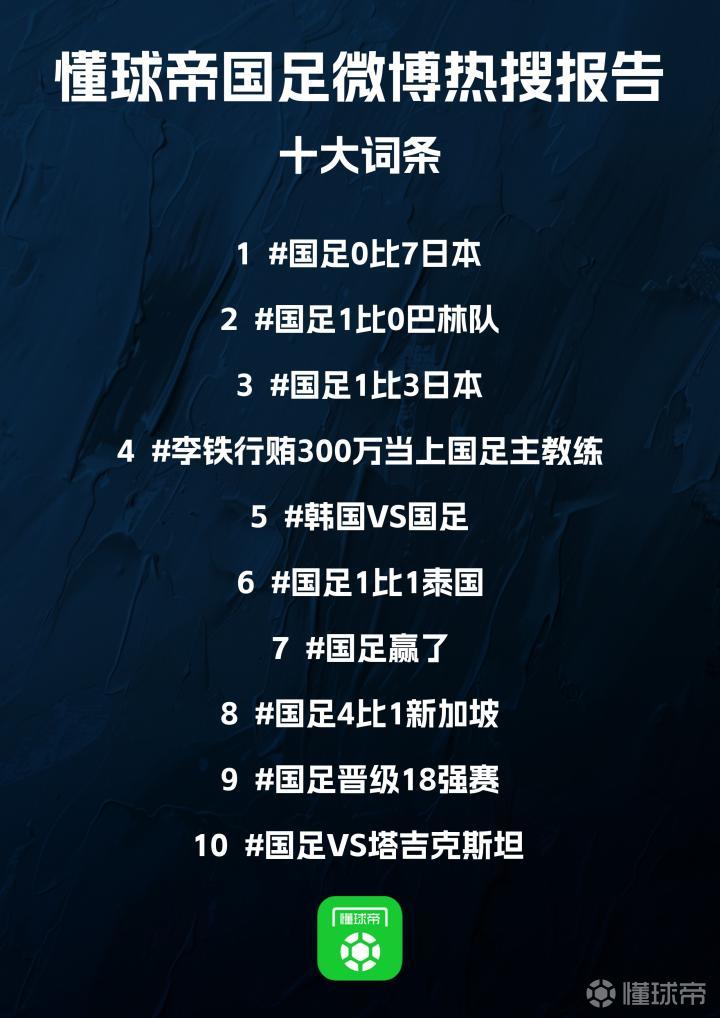 2024年,国足最受关注的十大热搜词条依次是:#国足0比7日本;#国足1比0巴林队;#国足1比3日本;#李铁行贿300万当上国足主教练;#韩国vs国足;#国足1比1泰国;#国足赢了;#国足4比1新加坡;#国足晋级18强赛;#国足vs塔吉克斯坦。