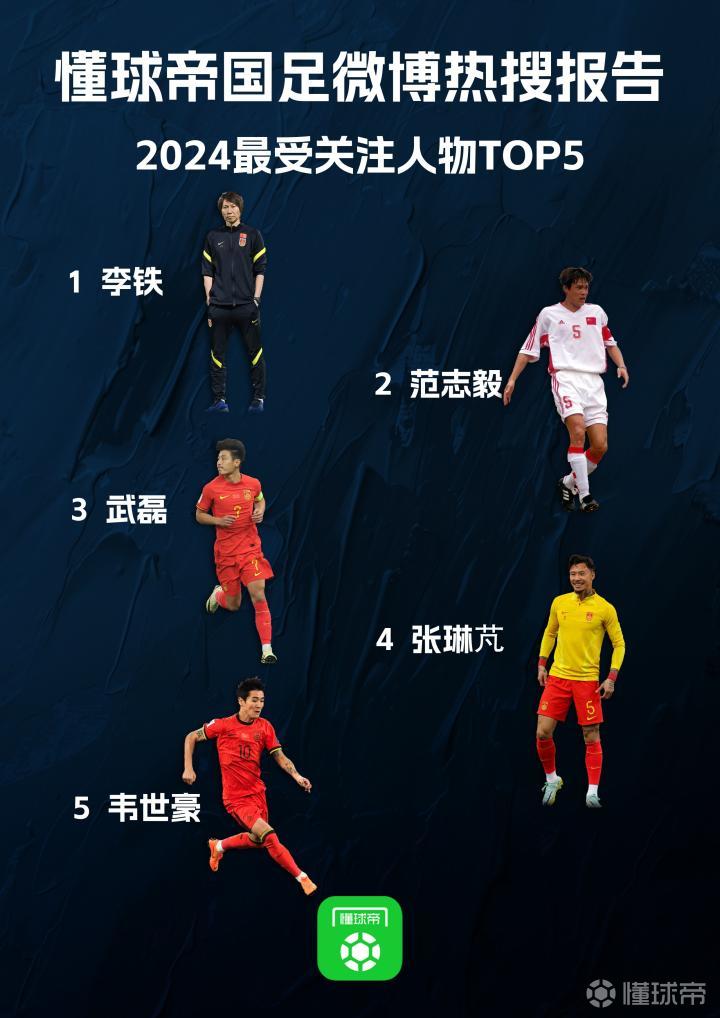 2024年,国足最受关注的热搜人物是:李铁、范志毅、武磊、张琳芃、韦世豪。
