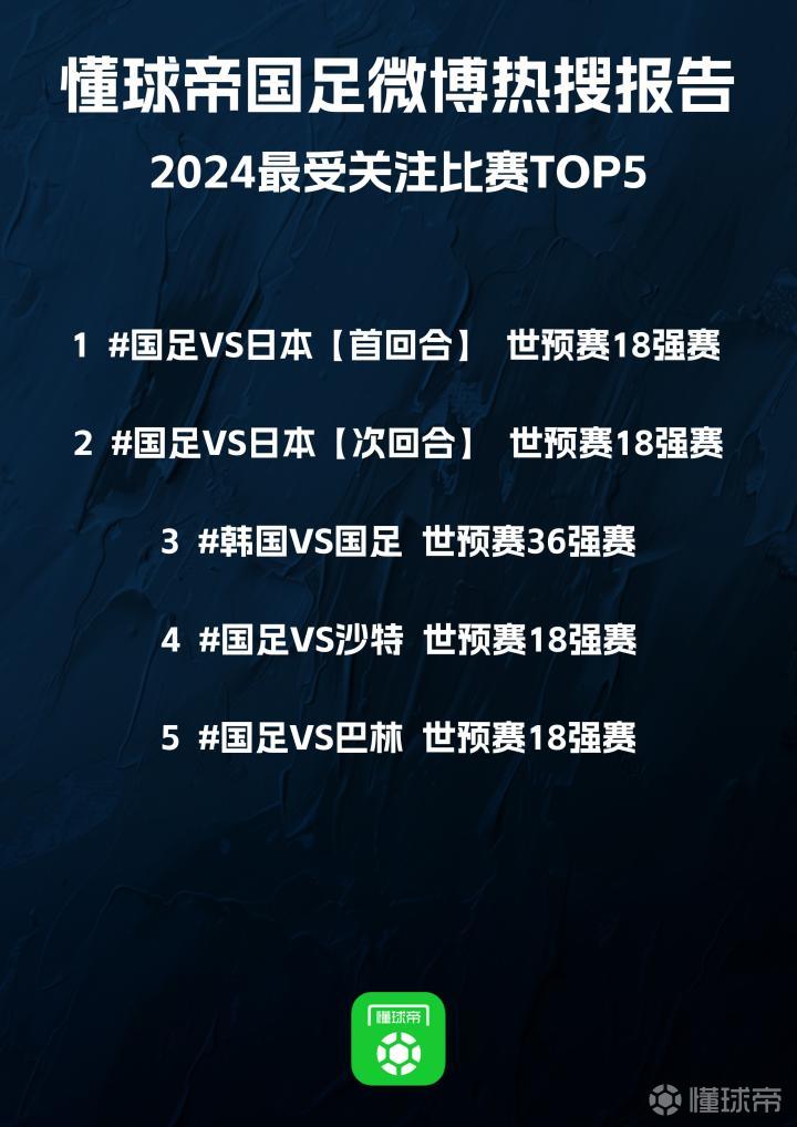 2024年,国足最受关注5场比赛是:#国足vs日本【第一回合】、#国足vs日本【第二回合】、#韩国vs国足、#国足vs沙特、#国足vs巴林