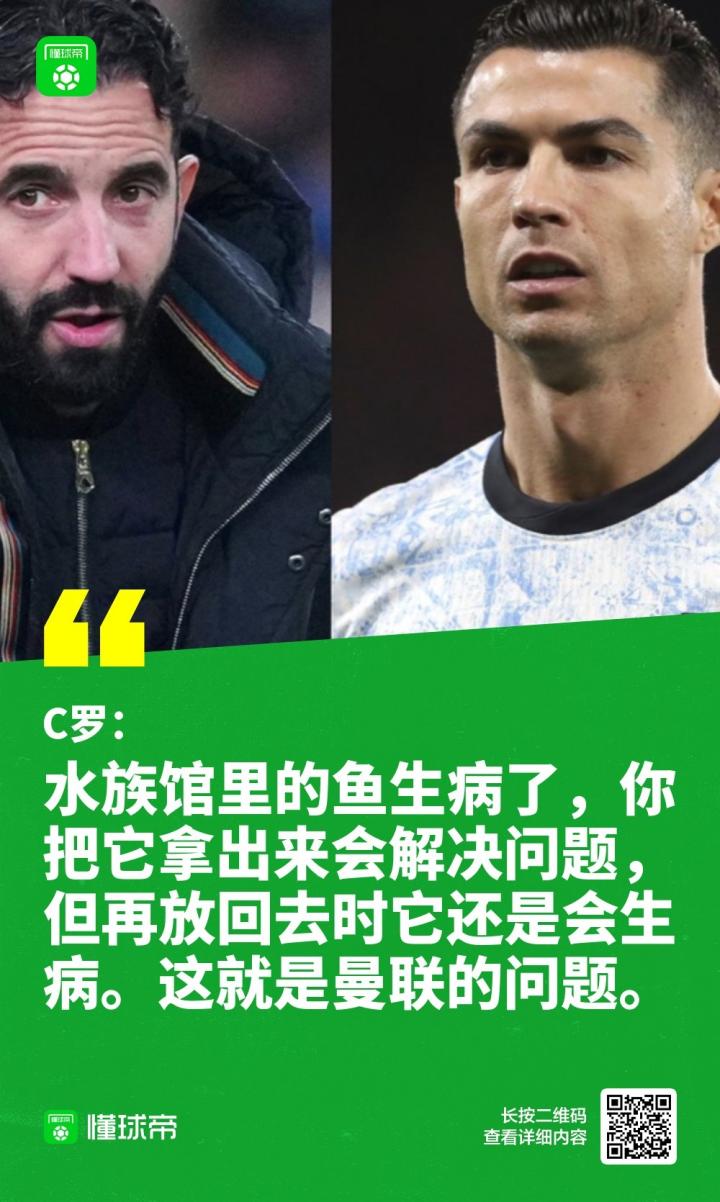 谈到球队目前的问题,C罗表示:“一年半前我就说过,并且我还会继续说:问题不在于教练。这就像水族馆里的鱼生病了,你把它拿出来会解决问题。如果你再把它放回水族馆,它还是会生病。这就是曼联的问题。还是一样。”