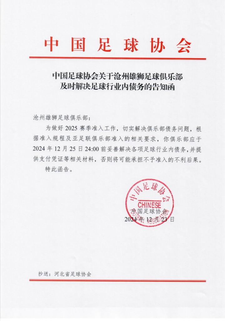 2024年12月24日,是足协第二批清偿名单的公示截止日。据了解,中国足协方面在公示期间收到了多个关于沧州雄狮俱乐部的投诉。中国足协随后向沧州雄狮发函,称俱乐部需要在12月25日24时完成债务清偿,沧州雄狮俱乐部未能如期完成。
