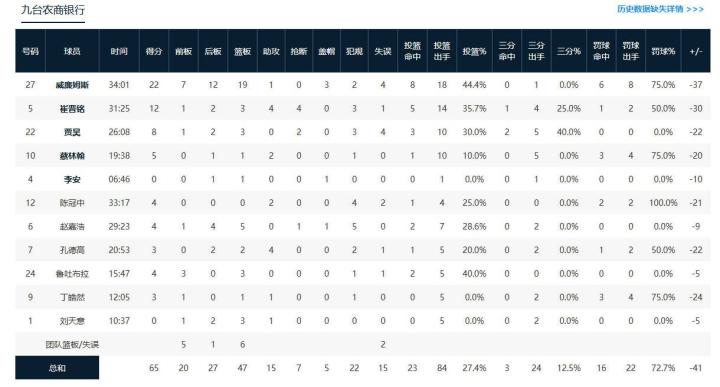九台农商银行毕格柏-威廉姆斯22分19板1助3帽,崔晋铭12分3板4助4断,贾昊8分3板2断;